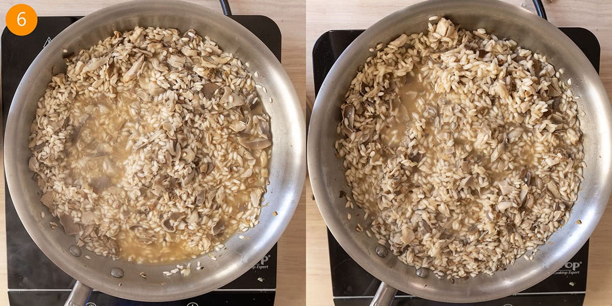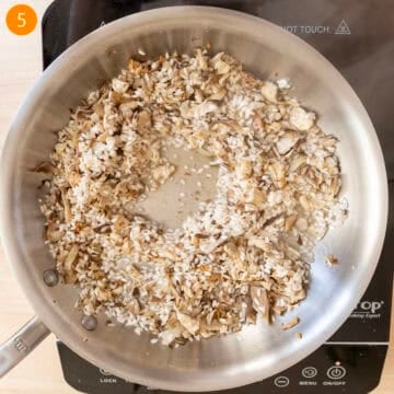 Step 4: Add the arborio rice and stir well with mushrooms and shallots to toast the rice for 2-3 minutes. You should start to see a small opaque circle in the rice as it toasts.