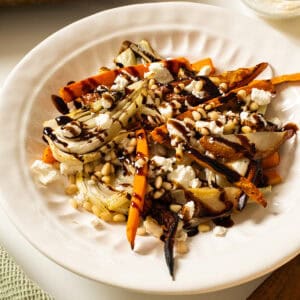 Classic Fall flavors combined for a sweet and savory vegetable dish with these Roasted Carrots and Fennel with pear. They're topped with a simple, delicious topping of pine nuts, goat cheese, and balsamic glaze that expertly brings the dish into a flavorful bite!