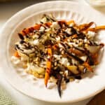 Perfectly roasted carrots and fennel with sweet pears, drizzled with balsamic glaze and topped with goat cheese and pine nuts.